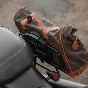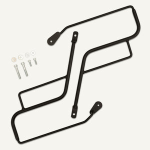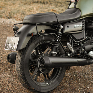 Pair of black steel saddlebag holders custom-made for the Moto Guzzi V7 III 750cc. Made from strong steel, they are designed to look good even when there is no saddlebag on.