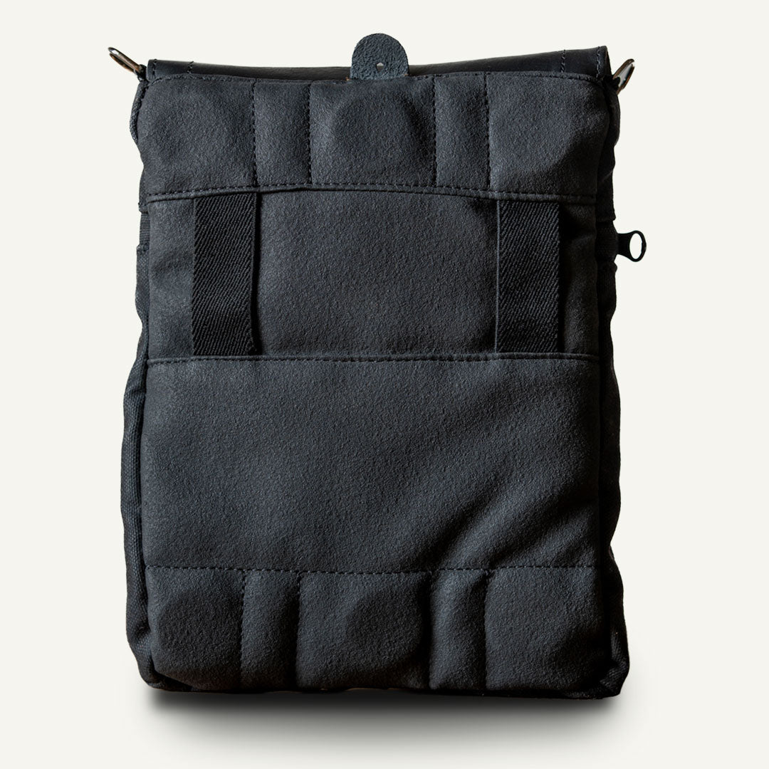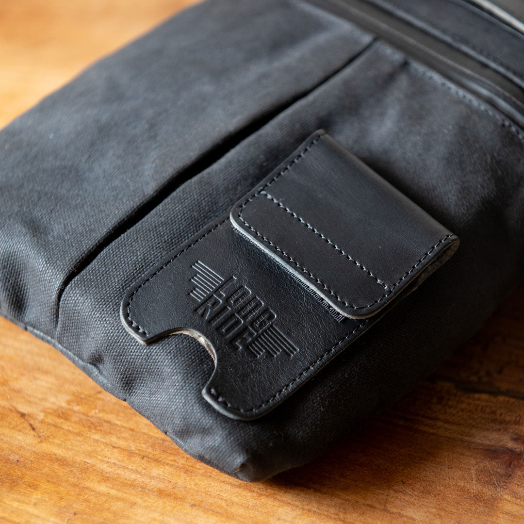 The back is built with a soft, custom rubber panel that won’t scuff paint, because a good tank bag should leave no trace. When the ride ends, it pops off in half a second. Clip on the shoulder strap via the side D-rings, or thread your belt through the two vertical elastic back loops and wear it at the waist. The Pod switches to shoulder bag or belt bag in an instant.