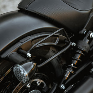 Upgrade your Indian with our custom-made black saddlebag holders, meticulously crafted from robust steel to seamlessly complement the mean style of the Bobber.