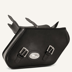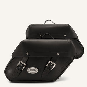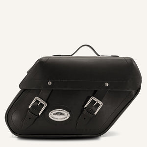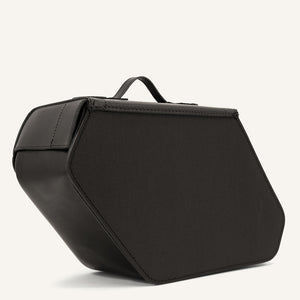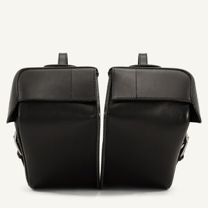 Set of 2 hard-shelled slanted leather panniers. The Classic 35 are wrapped in high-quality black leather, finished for maximum durability. Oiled on the outside, and sealed from the inside to block humidity.