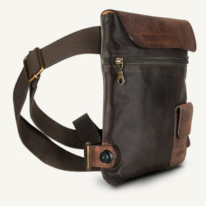 The Holster bag is cut from our best materials. With full-grain, vegetable-tanned leather and thick waxed-canvas, it's guaranteed to last for thousands of miles. Even the German-made fastening buckle inspires confidence.